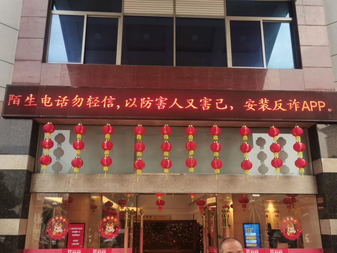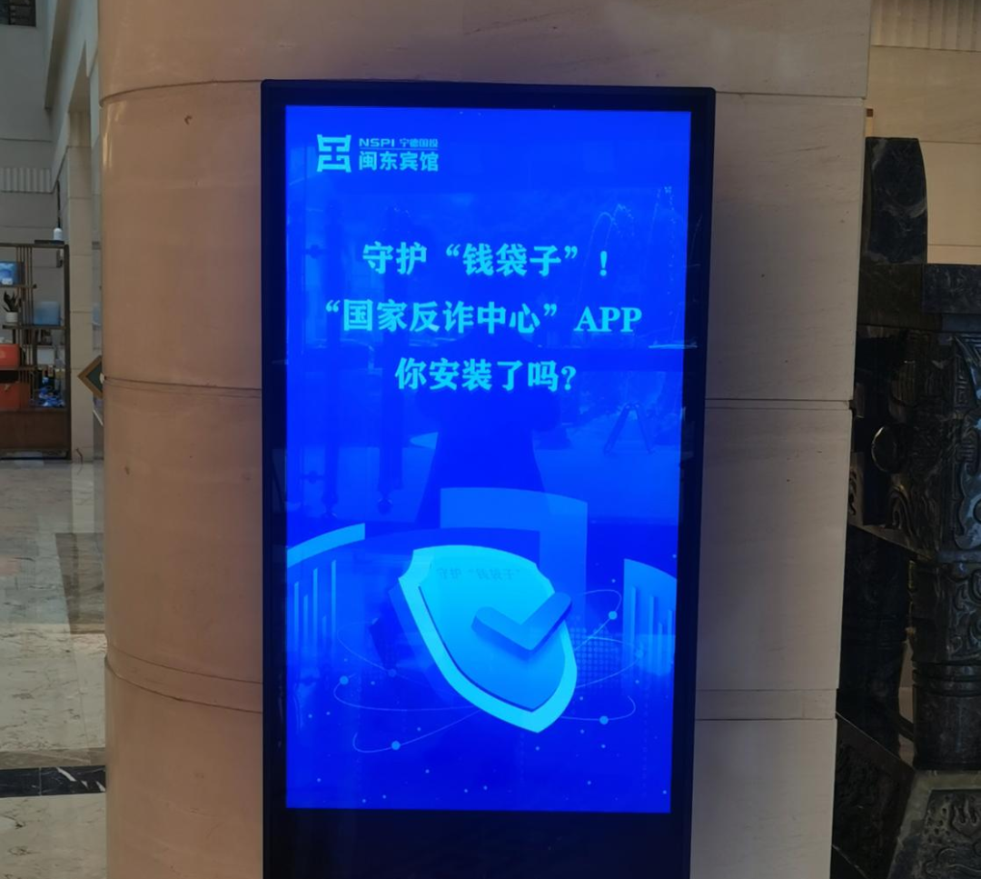 闽东宾馆在公司内部大型广告宣传机上播放宣传海报,LED屏滚动播放宣传标语,同时督促全公司职工及家属安装“国家反诈中心”APP,督促员工参与市国资委相关问卷调查活动,以及在公司微信群和公众号上转载“宁德公安”等新媒体公众号发布的反诈知识和相关案例。