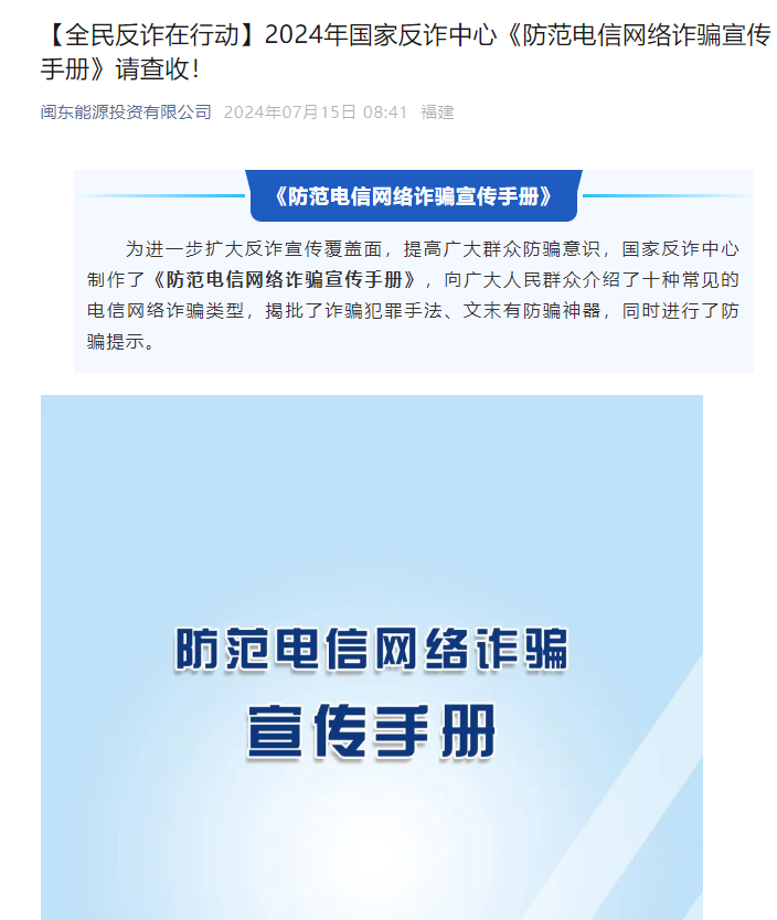 能源公司通过微信公众号平台及时转载国家反诈中心的公益宣传积极宣传防诈知识;利用多媒体设施滚动播放反诈视频,引领职工珍惜生活,远离电信网络诈骗。
