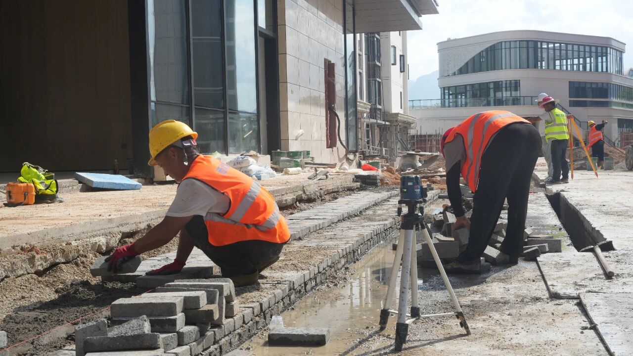 项目现场,作业工人们头戴安全帽,在工地上忙碌着,工作服早已被汗水浸透,即便如此,他们的身影依然活跃在各个施工点,有的俯身砌砖,砖缝间的砂浆抹得均匀平整;有的肩扛钢筋,在工地间稳健穿梭;有的在认真开展室外景观构筑物现场定位放样,每个人都专注于手中的活计,用严谨匠心守护着工程质量。为保障工人安全作业,项目现场专门设置了茶水间,供应金银花茶等防暑饮品,为工人驱散暑气。同时,宁德市住建局工会也专程来到工地开展防暑降温慰问,不仅送来了清凉物资,还反复叮嘱项目方要合理调整工时,避开正午高温时段,确保施工安全。