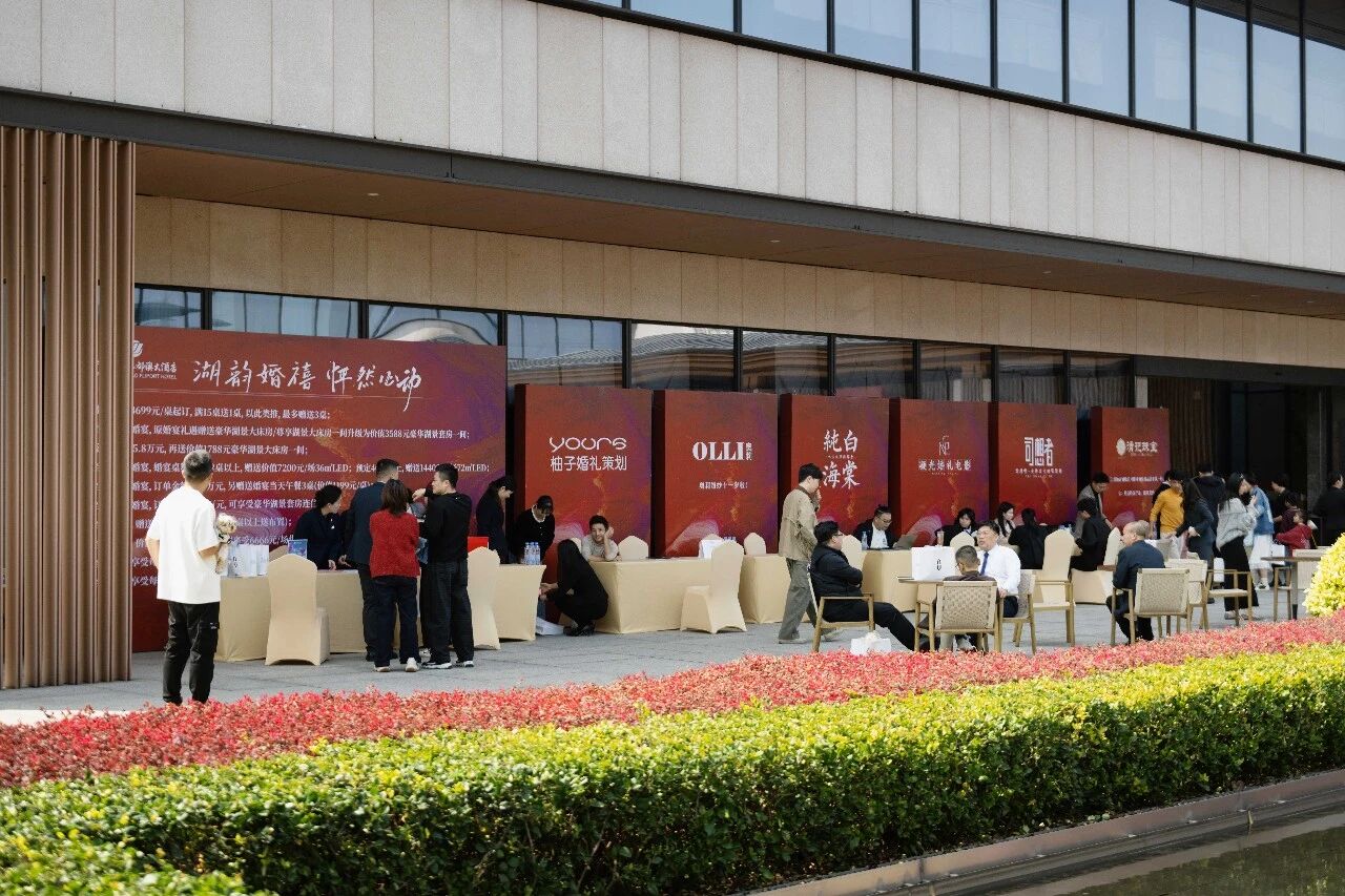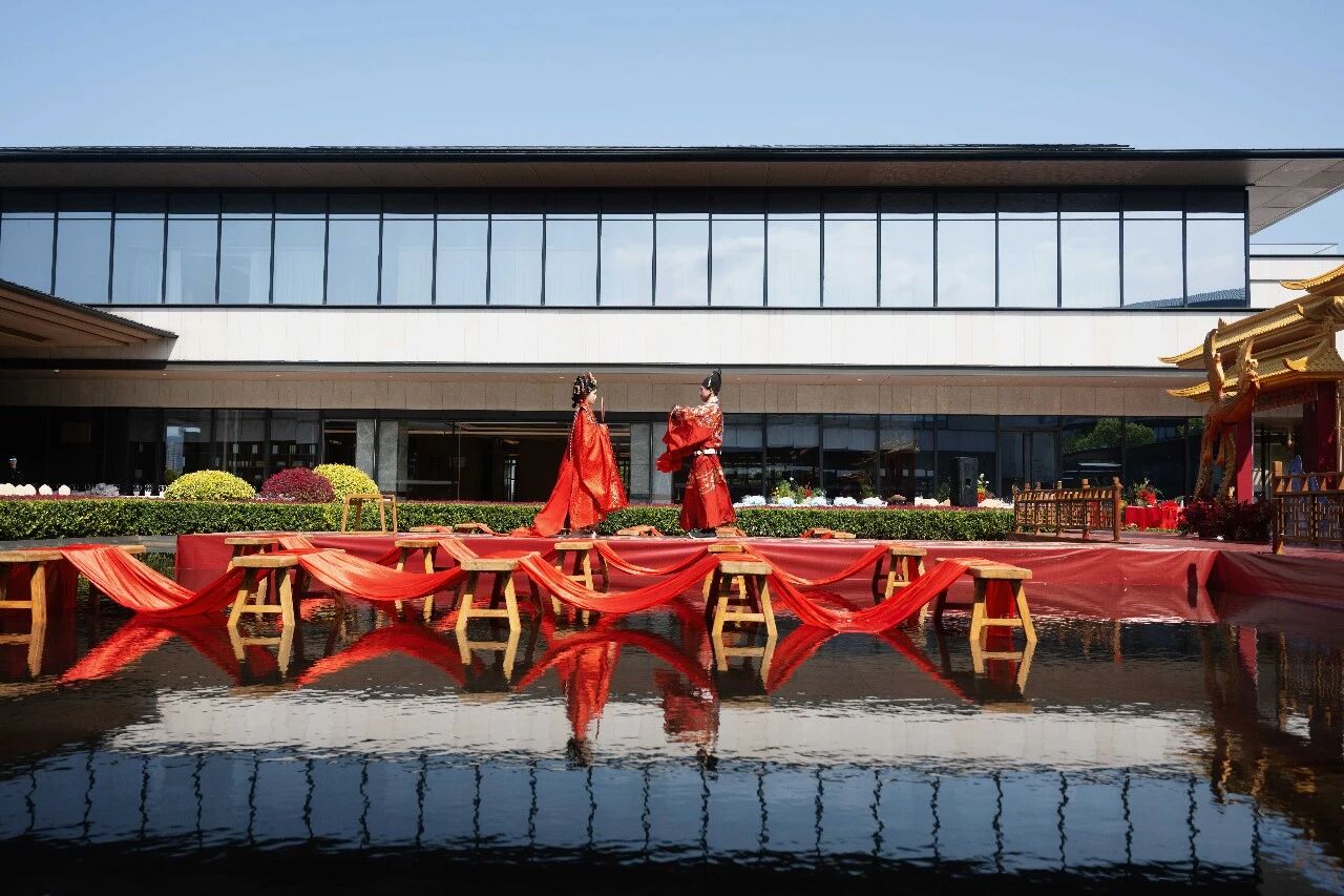 本次婚礼秀以“良辰・序”为主题,取吉时礼赞、新篇启卷之意。酒店依托中庭水池与园林景观,将中式雅致与水景光影相融,意境十足。现场依次呈现敬茶、合卺酒、系红绸等传统仪式,搭配互动抽奖、精致茶歇、插花体验等环节,让来宾沉浸式感受传统婚俗的仪式感与雅致趣味。